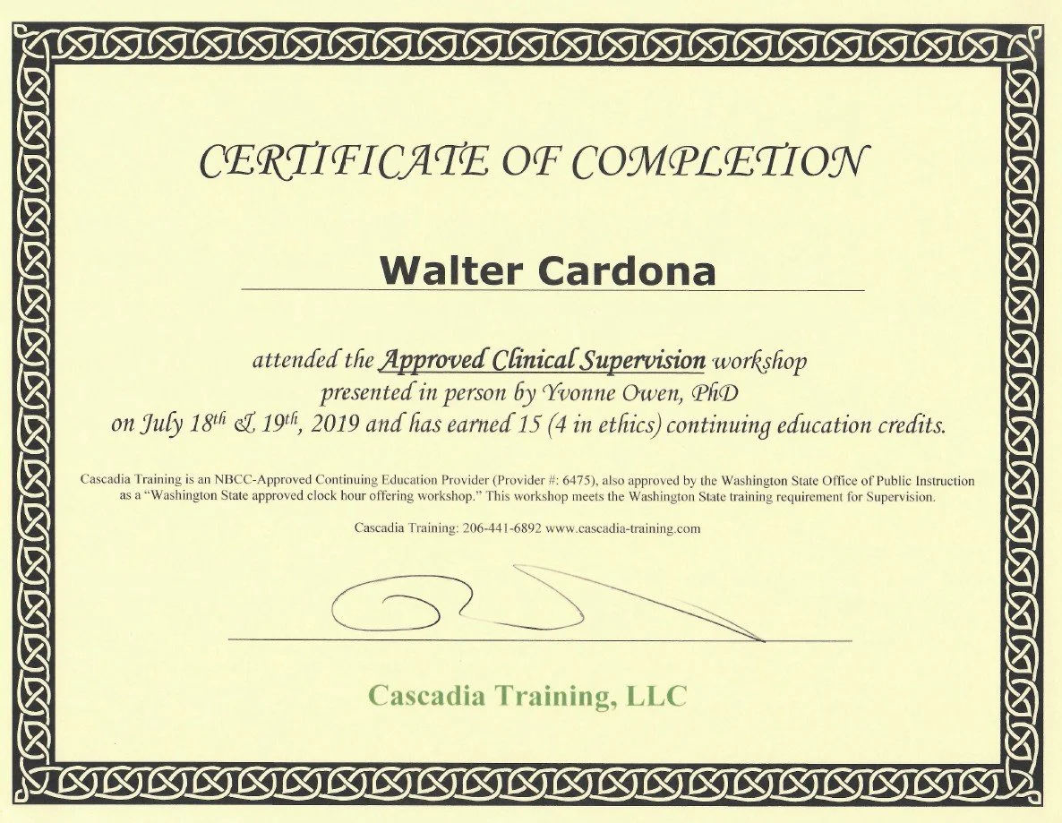 Walter Cardona, M.Ed. is a Washington State Licensed Mental Health Counselor (LMHC) and Washington State Approved Clinical Supervisor offering individual and group supervision for clinicians working toward independent licensure. He has met the requirements to be an approved clinical supervisor in accordance with the WAC-246-809-234. He supports associates in developing strong clinical skills, ethical confidence, and a sustainable professional identity. Cardona Counseling Clinical Supervision offers: